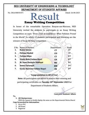NED University held an Essay Writing Competition on “From Crisis to Confidence: What Pakistan Proved to the World” in honor of Operation Bunyan-um-Marsoos. We are proud that Rania Imran secured 1st position, while Fatima Khan achieved 2nd position. Their success is a moment of pride for the Department of Computer & Information Technology.